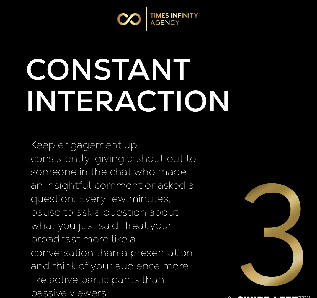 Keep engagement up consistently, giving a shout to someone in the chat who made an insightful comment or asked a question. Every few minutes, pause to ask a question about what you just said. Treat your broadcast more like a conversation than a presentation, and think of your audience more like active participants than passive viewers.