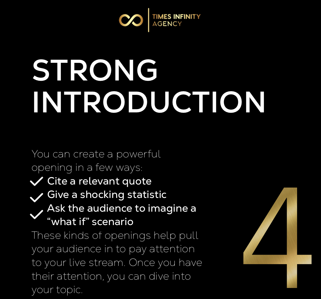 These kinds of openings help pulls your audience in to pay attention to your livestream. Once you have their attention, you can dive into your topic.